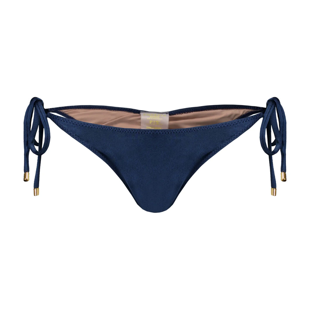 Ruchy bottom with side ties for an adjustable fit and adorned with gold hardware