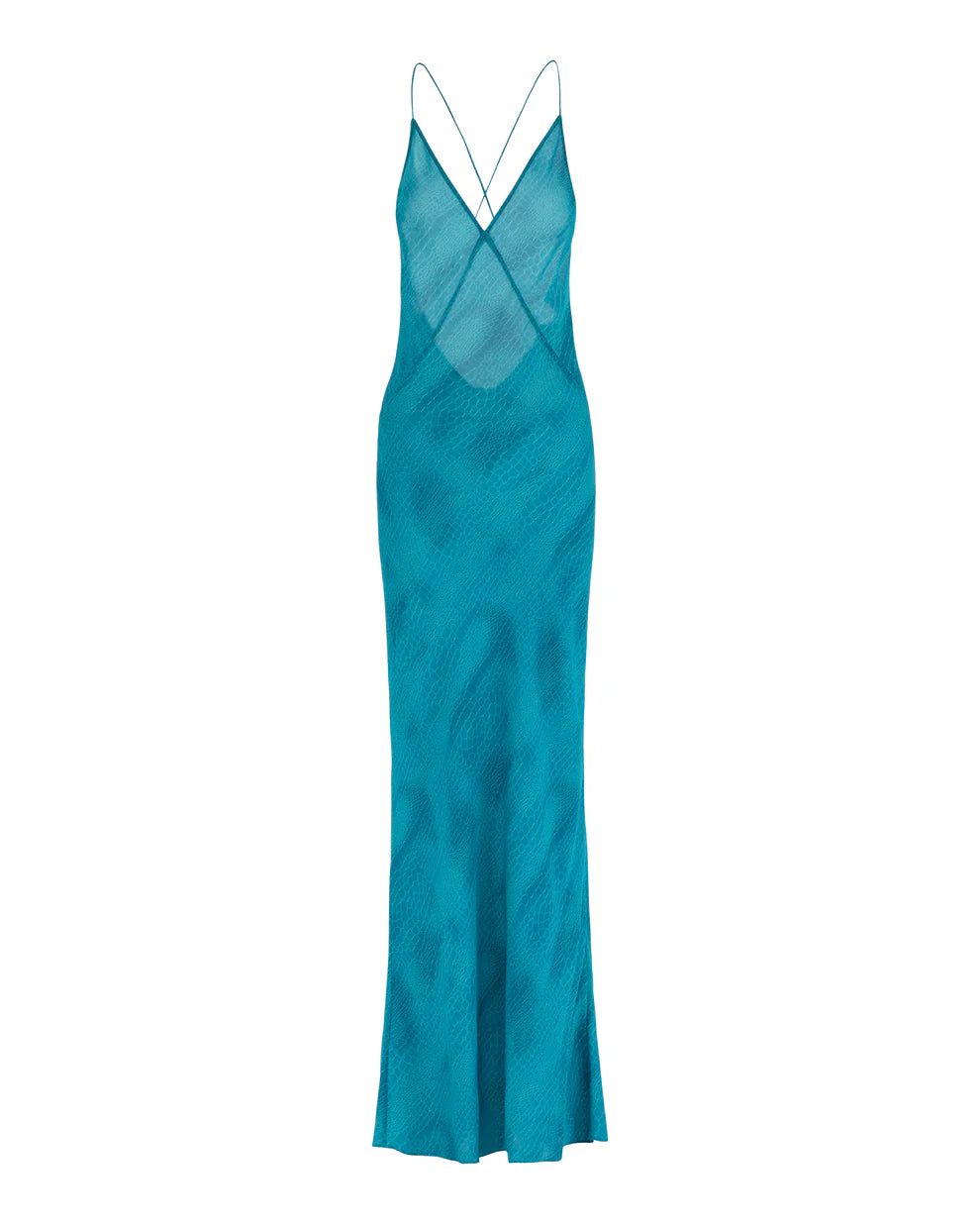 Elvira is our signature slinky silhouette inspired by Michelle Pfeiffer's role as Elvira in Scarface. Features a low back and floor-kiss length, perfect for a high heel. Cut on the bias from 100% silk crepe with a matte finish in our signature "Aquazzura" print, a crocodile dream that emulates the movement and color of the sea. Elvira is elegantly simple from the front, with a seductive low back.