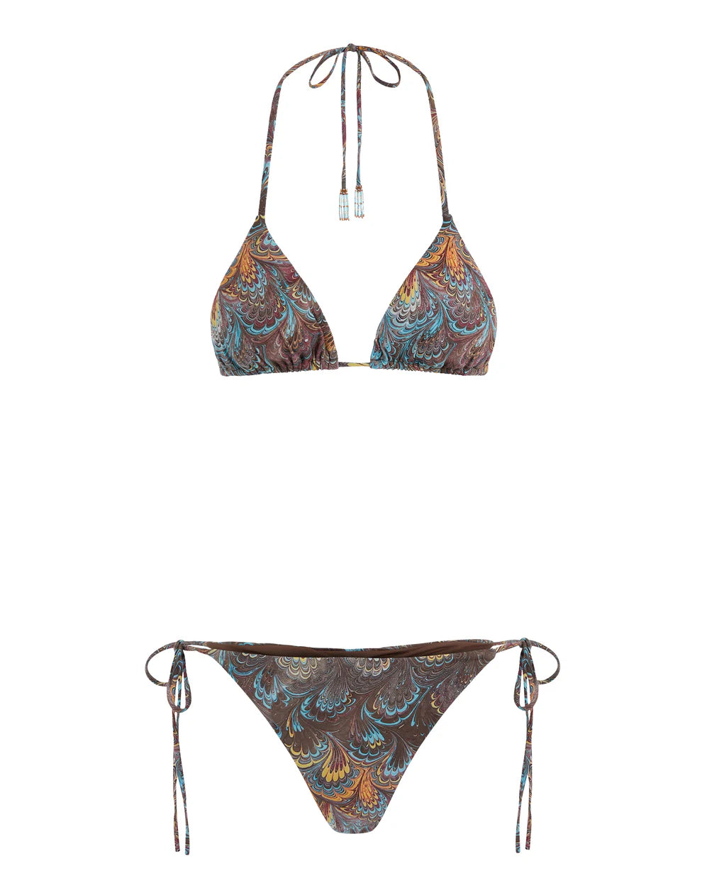 Our signature triangle bikini with thin multiway straps can be worn straight or around the neck, embellished with beads for a sophisticated touch. Medium coverage ruched bottoms, cut from 100% Italian lycra in our signature "Marmo" Florentine print, steeped in the colors of the Mediterranean coast.